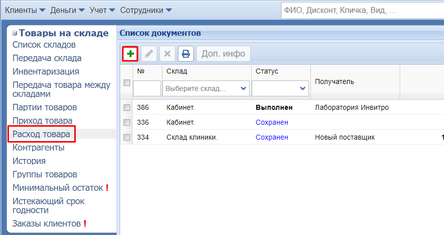 Переходим в Склад - Расход товара - жмем Добавить (зеленый плюс).