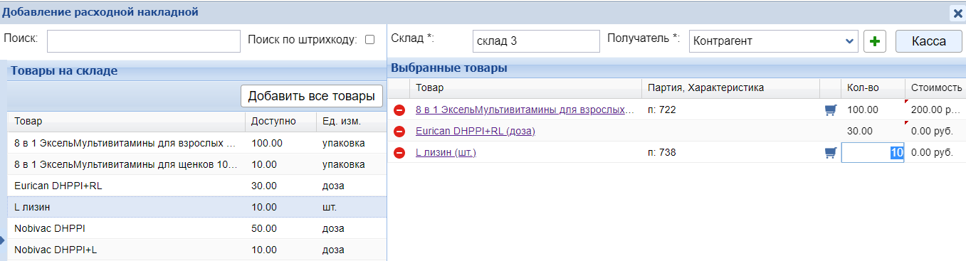 Если у товара больше одной партии, то в поле Партия, Характеристика будет предложено указать желаемую для списания товара партию. Пока не выбрана нужная партия, значение в поле Стоимость будет оставаться 0.00. После указания партии, в поле Количество будет по умолчанию выставлено максимально возможное количество для партии. При клике на поле можно поменять это значение на желаемое. Стоимость при изменении партии или количества будет рассчитываться автоматически.