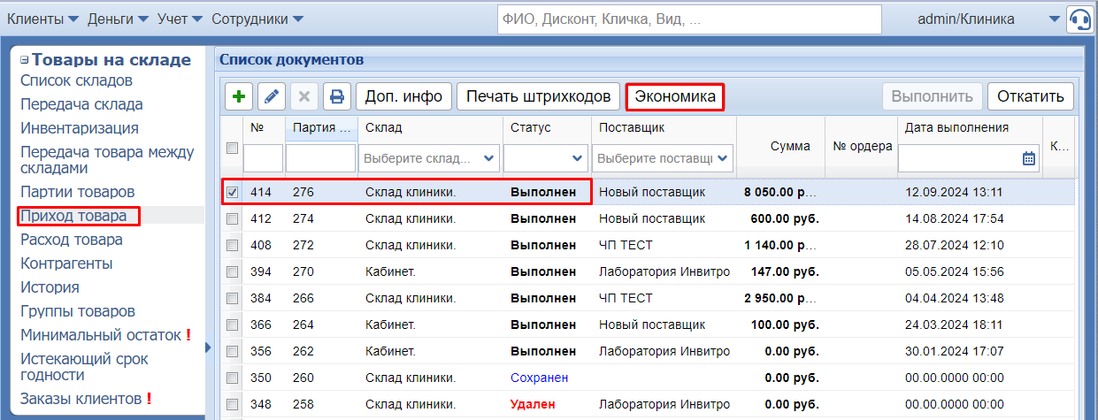 В складе после заведения приходных накладных можно отслеживать изменения цены товара. Для этого используйте кнопку Экономика.