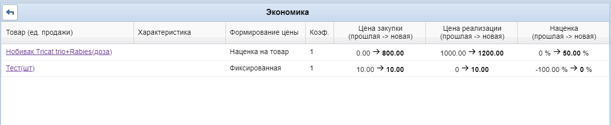• Цена закупки (прошлая - новая)