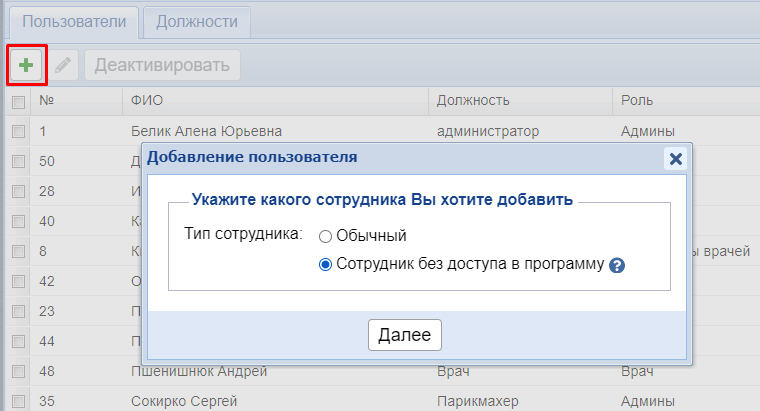 Для создания сотрудника без доступа в программу, необходимо перейти в модуль Управление сотрудниками и нажать кнопку Добавить (зеленый плюс).