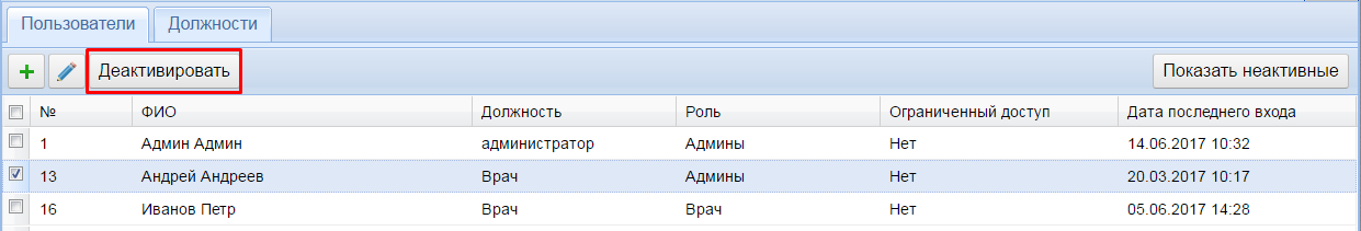 При необходимости любого деактивированного пользователя можно активировать, если он должен иметь доступ в программу.