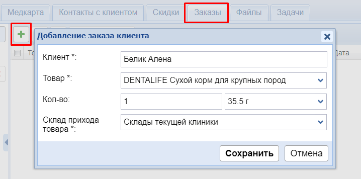 В профиле клиента находится вкладка Заказы, из которой можно добавить или просмотреть заказ товара клиентом.  Для добавления нового заказа откройте вкладку и нажмите кнопку Добавить (зеленый плюс).
