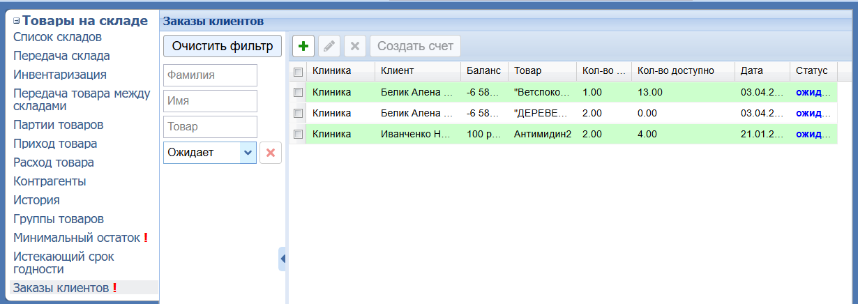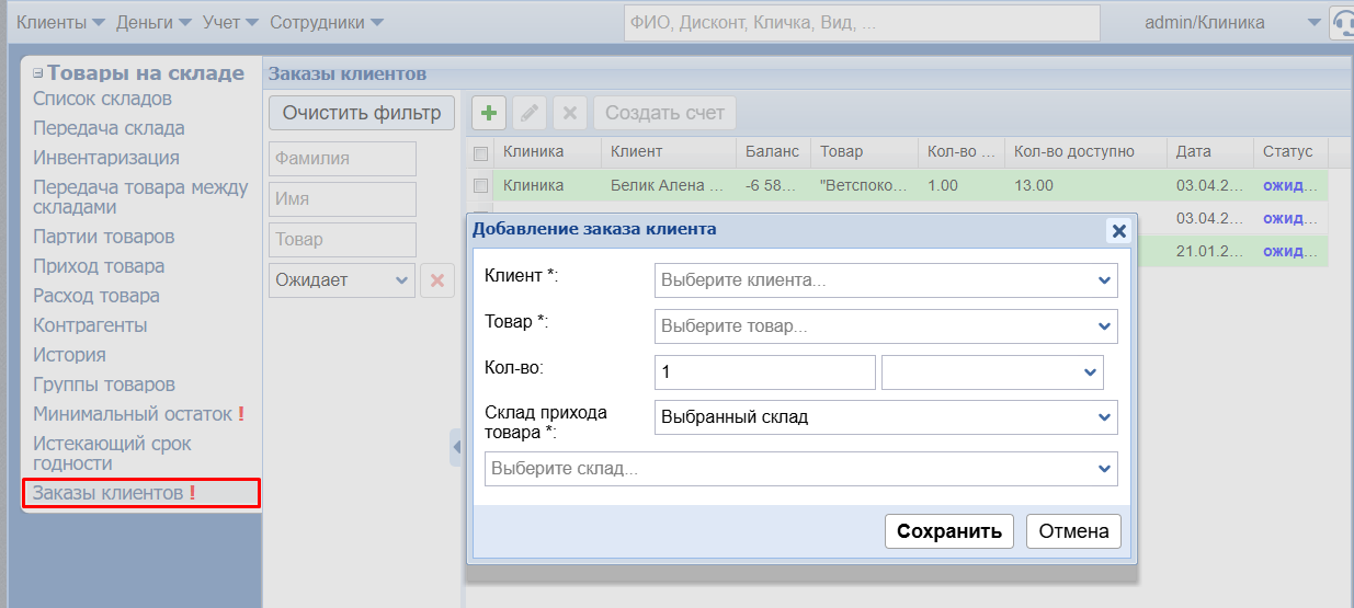Если позиции нет в наличии в данный момент, клиент может сделать заказ товара. Когда он появится на складе клиники, программа оповестит об этом сотрудника.