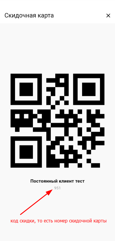 При нажатии на иконку откроется страница с QR-кодом, который ваш клиент для применения скидки может показать перед оплатой счета.