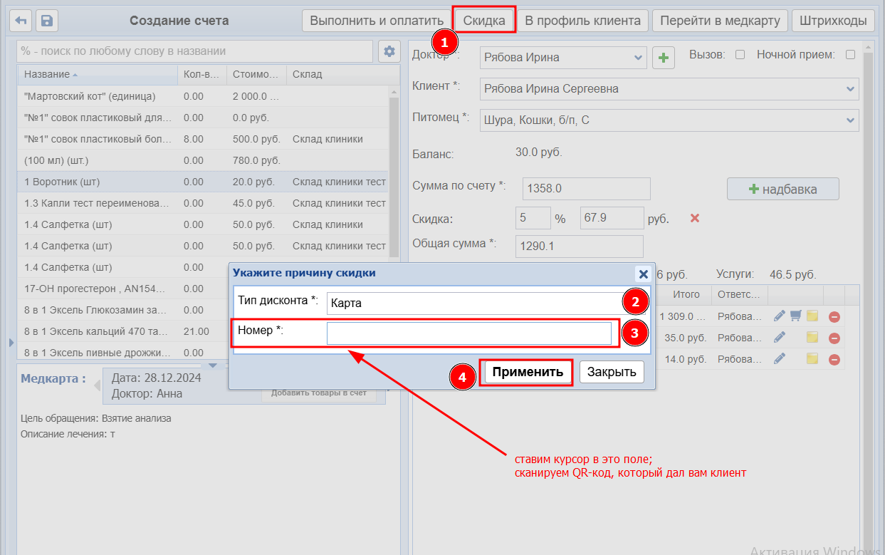 В счете, созданном на клиента, для применения скидки нажмите кнопку Скидка - выберите тип дисконта Карта. Поставьте курсор в поле Номер и считайте QR-код, который предоставил клиент.