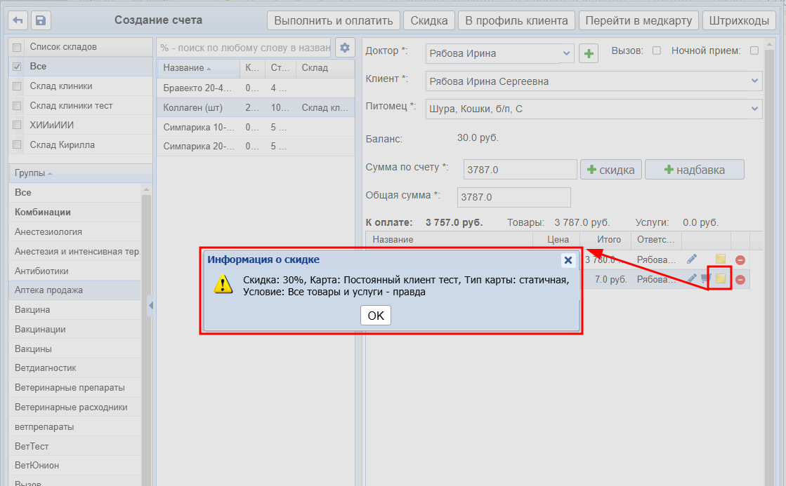 После этого в счете напротив позиций, на которые должна распространяться скидка, появится желтый квадрат, при клике на него можно проверить, какая скидка применилась.