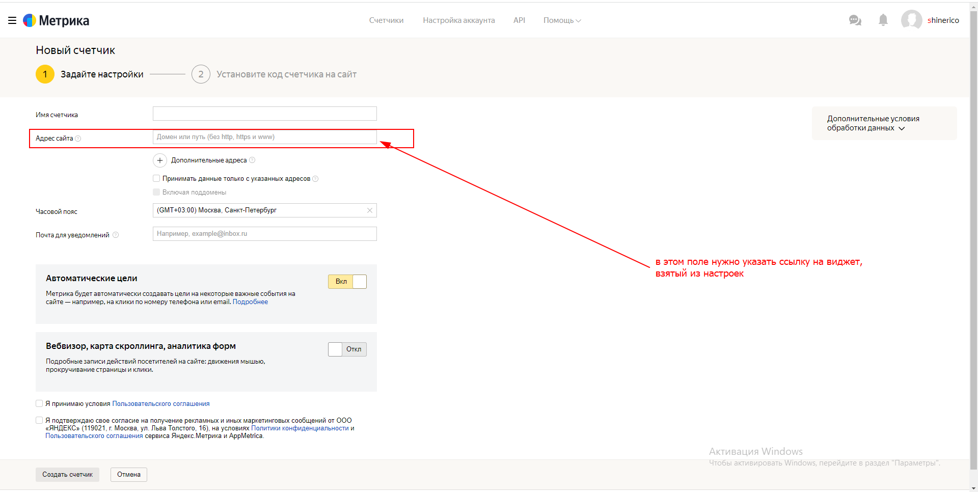 В поле Адрес сайта нужно указать ссылку на созданный виджет. Эту ссылку можно найти в настройках виджета.