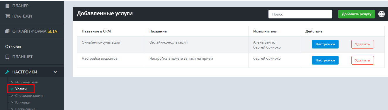 Далее в виджете необходимо перейти в раздел Настройки — Услуги. Найти услугу, за которую нужно принимать онлайн-оплату, и зайти в ее Настройки