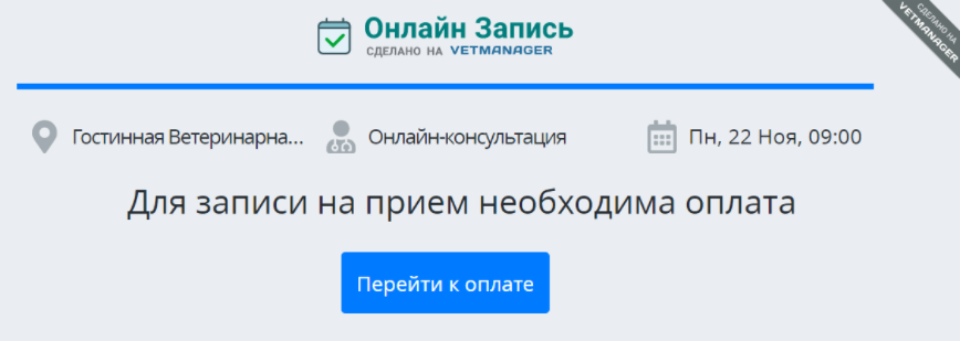 Если у услуги настроена оплата онлайн, когда клиент записывается на прием, после заполнения данных он видит сообщение: Для записи на прием необходима оплата.