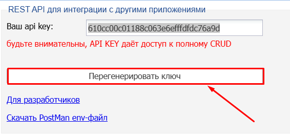 2. Нажмите "Перегенерировать ключ", чтобы система сгенерировала новый ключ. При этом старый перестанет работать.