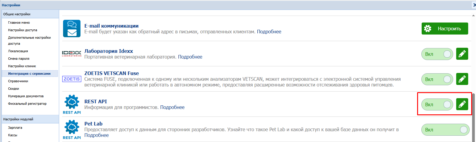 1. Перейдите в Настройки — Интеграция с сервисами — REST API