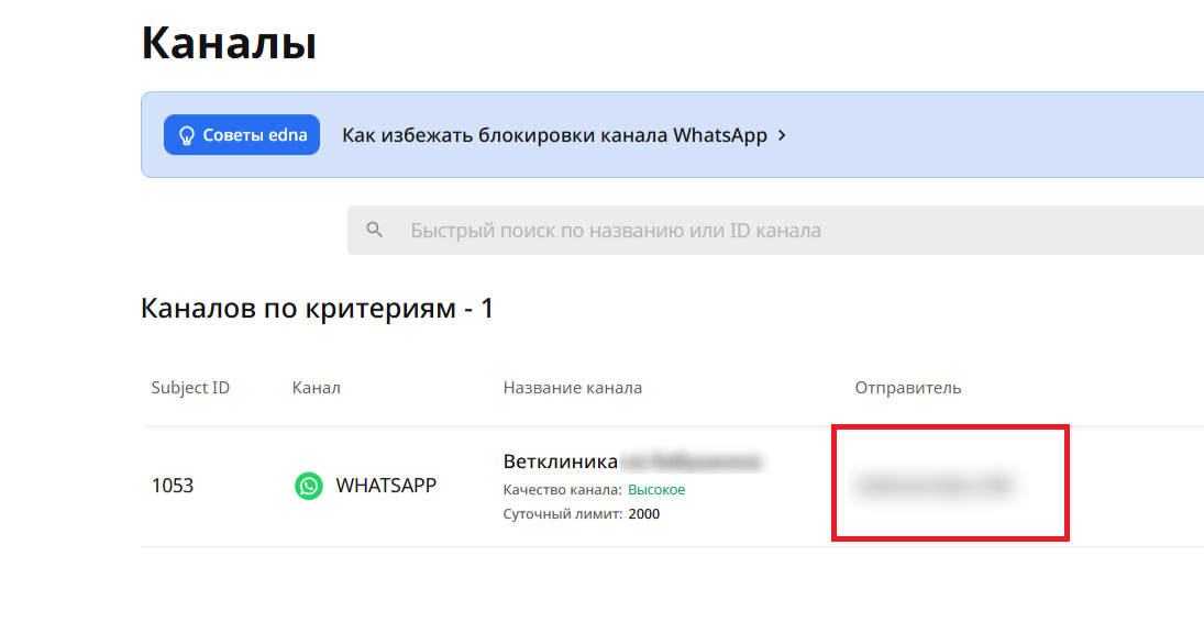 После создания канала необходимо вставить API ключ и имя отправителя в настройках интеграции edna в виджете по ссылке.