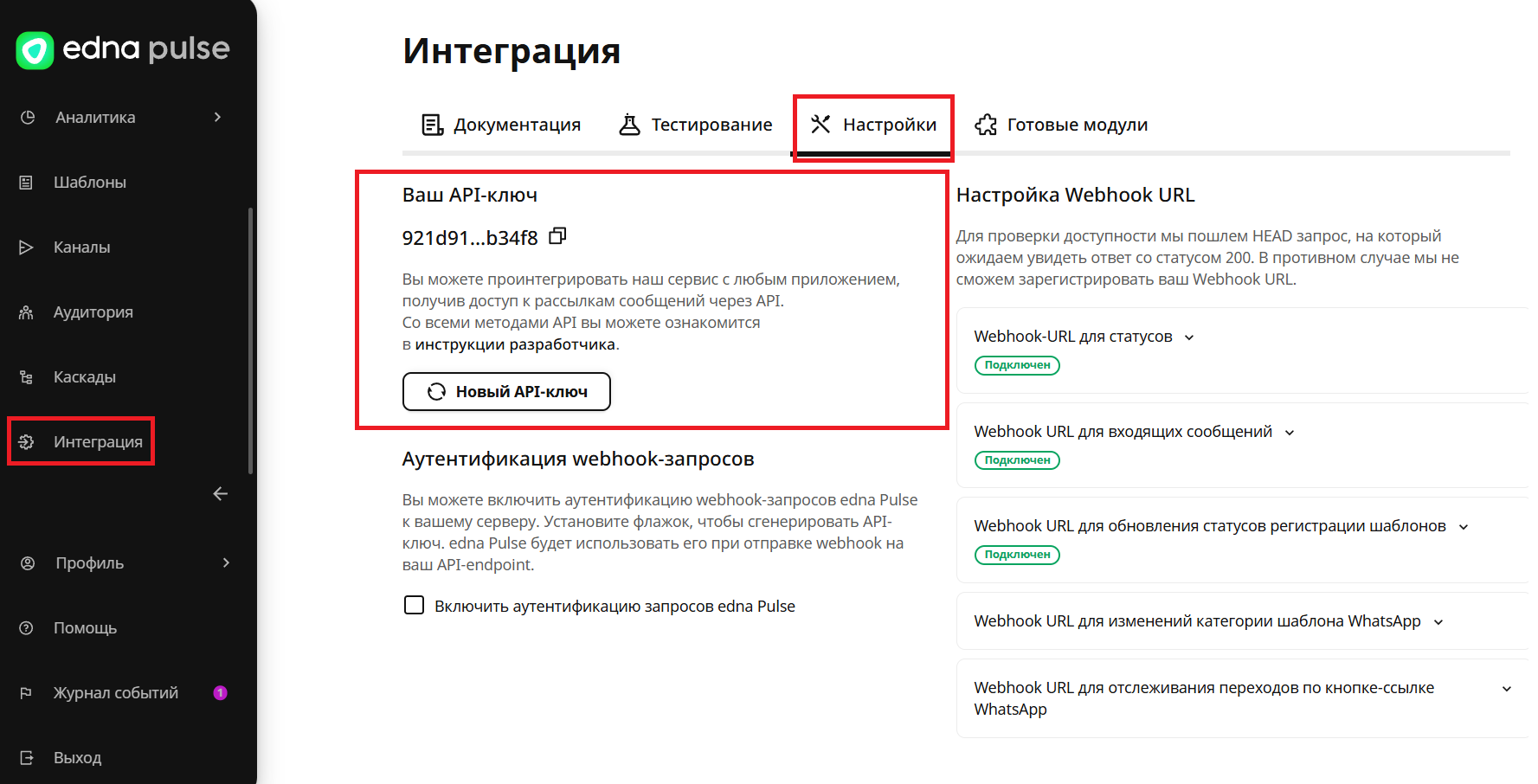 Перейдите в настройки интеграции и сгенерируйте API ключ
