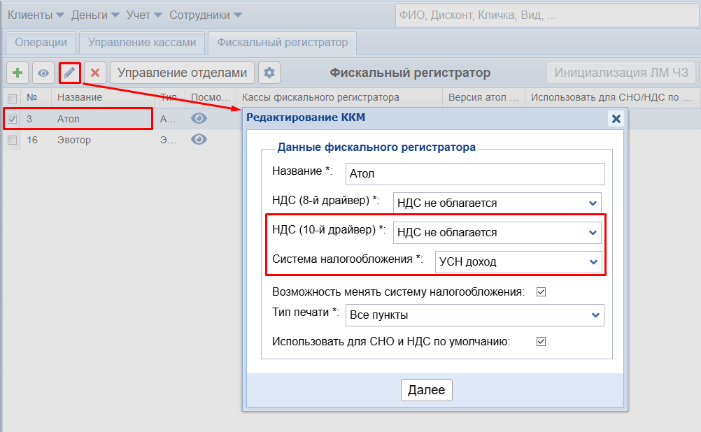 Выберите вашу систему налогообложения и НДС (в разделе НДС 10-й драйвер). Несколько раз нажмите Далее и сохраните изменения.