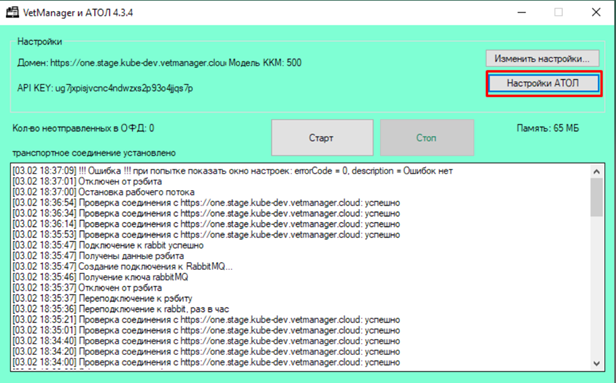 Нажать кнопку Стоп, затем Настройки АТОЛ.