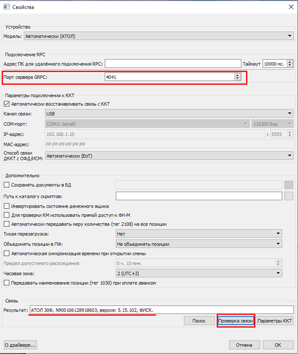 Редактировать поле Порт сервера GRPC: 4041. Нажать Проверка связи. Должен появиться результат проверки: