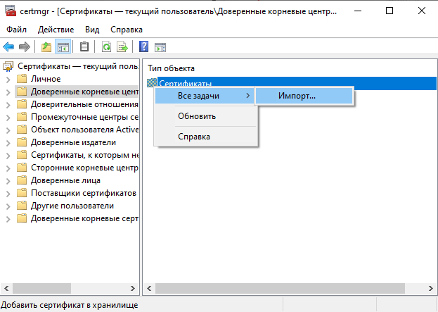 1. Открыть certmgr.msc (через Win+R → ввести certmgr.msc).